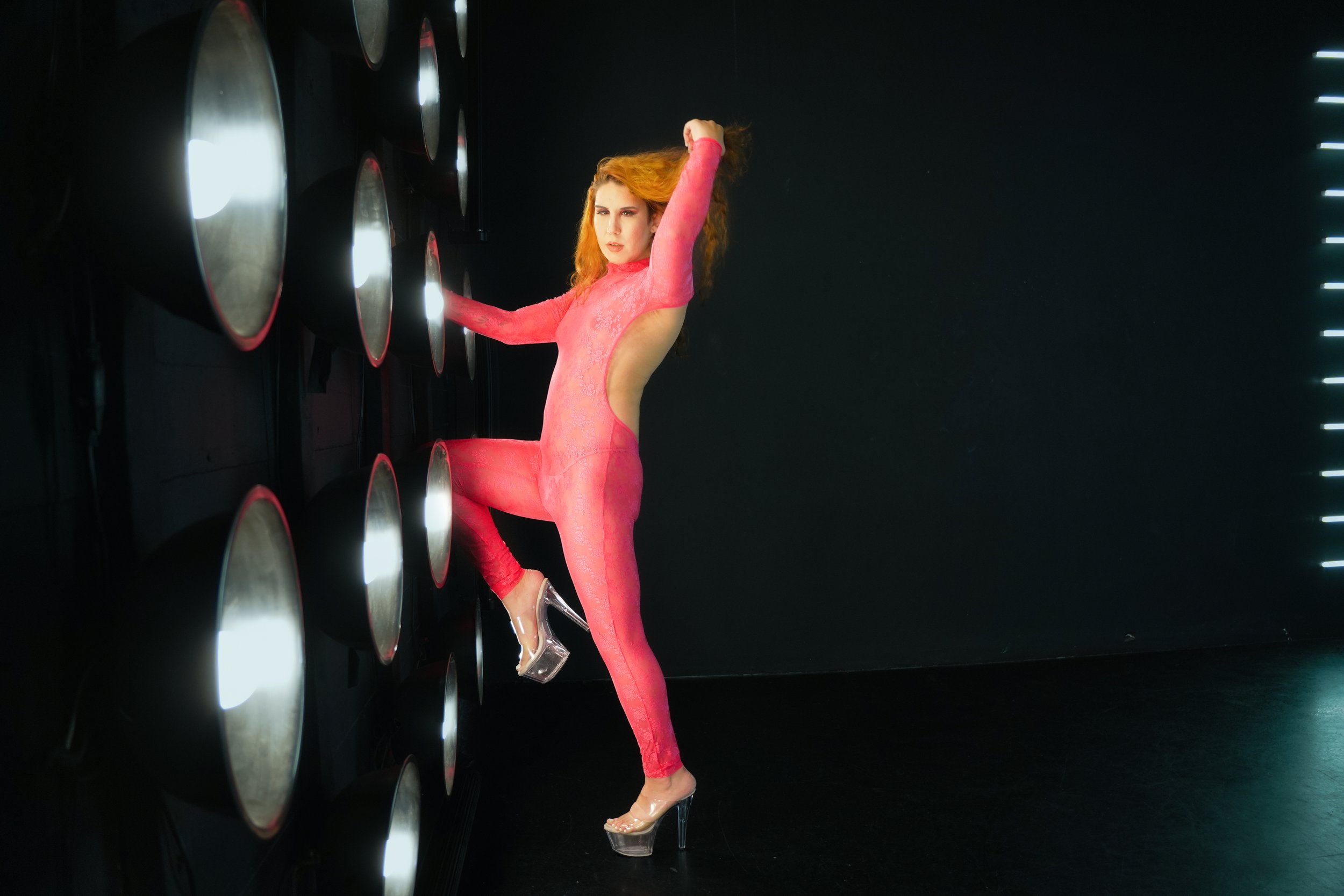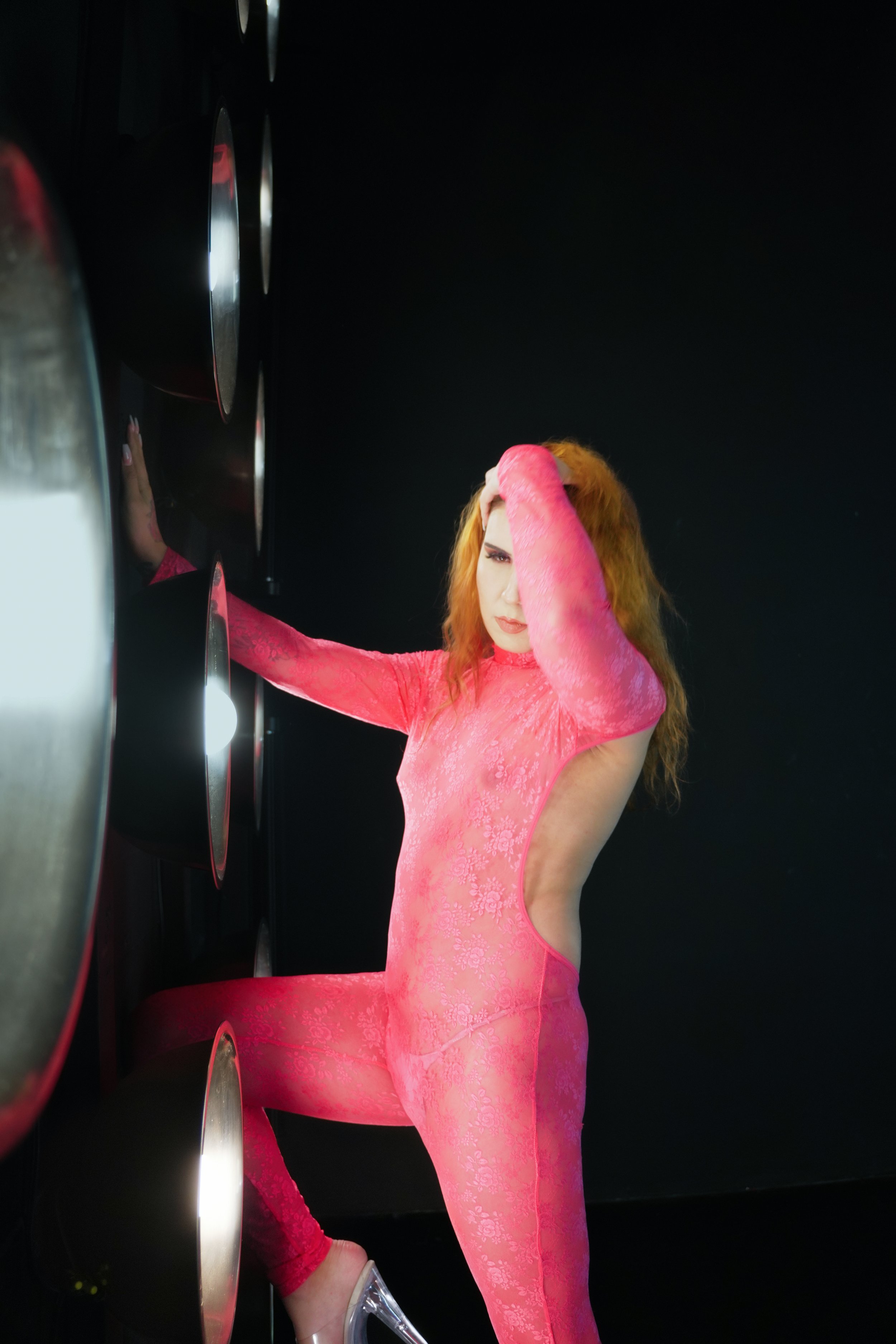 A woman with long red hair wearing a sheer pink lace jumpsuit leaning against illuminated vinyl records on a black wall.