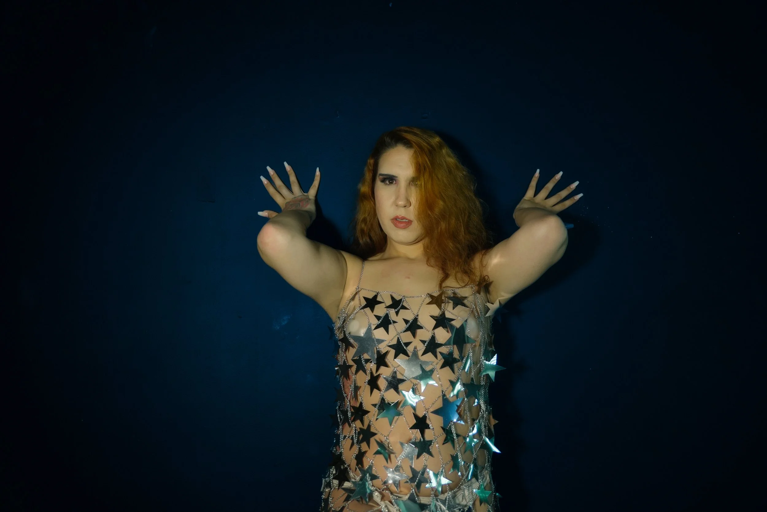 Woman with curly red hair wearing a dress made of metallic stars, standing against a dark blue background, with arms raised and an intense facial expression.
