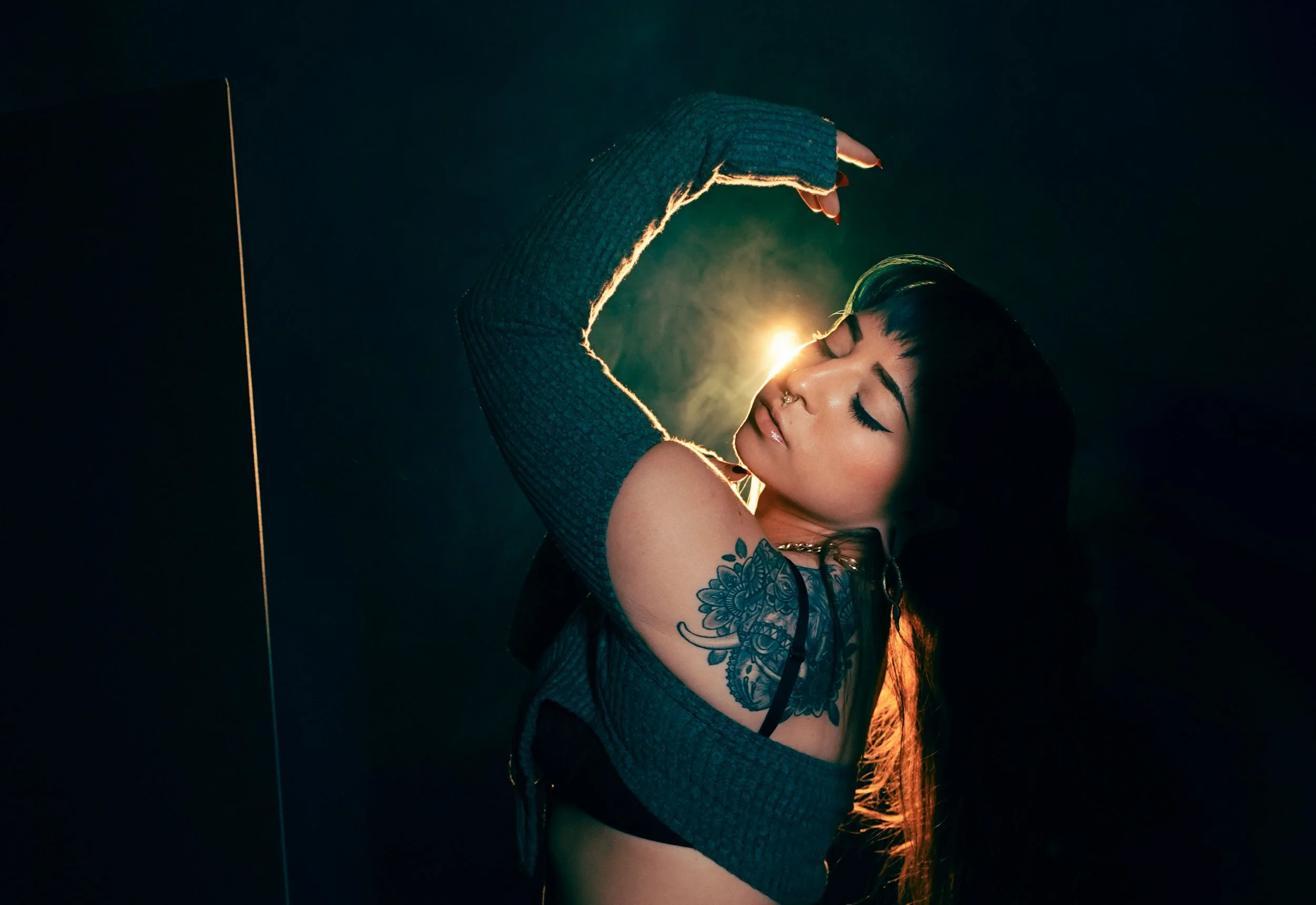 A young woman with long dark hair and tattoos on her shoulder poses with her eyes closed against a dark background, illuminated by a warm light behind her.