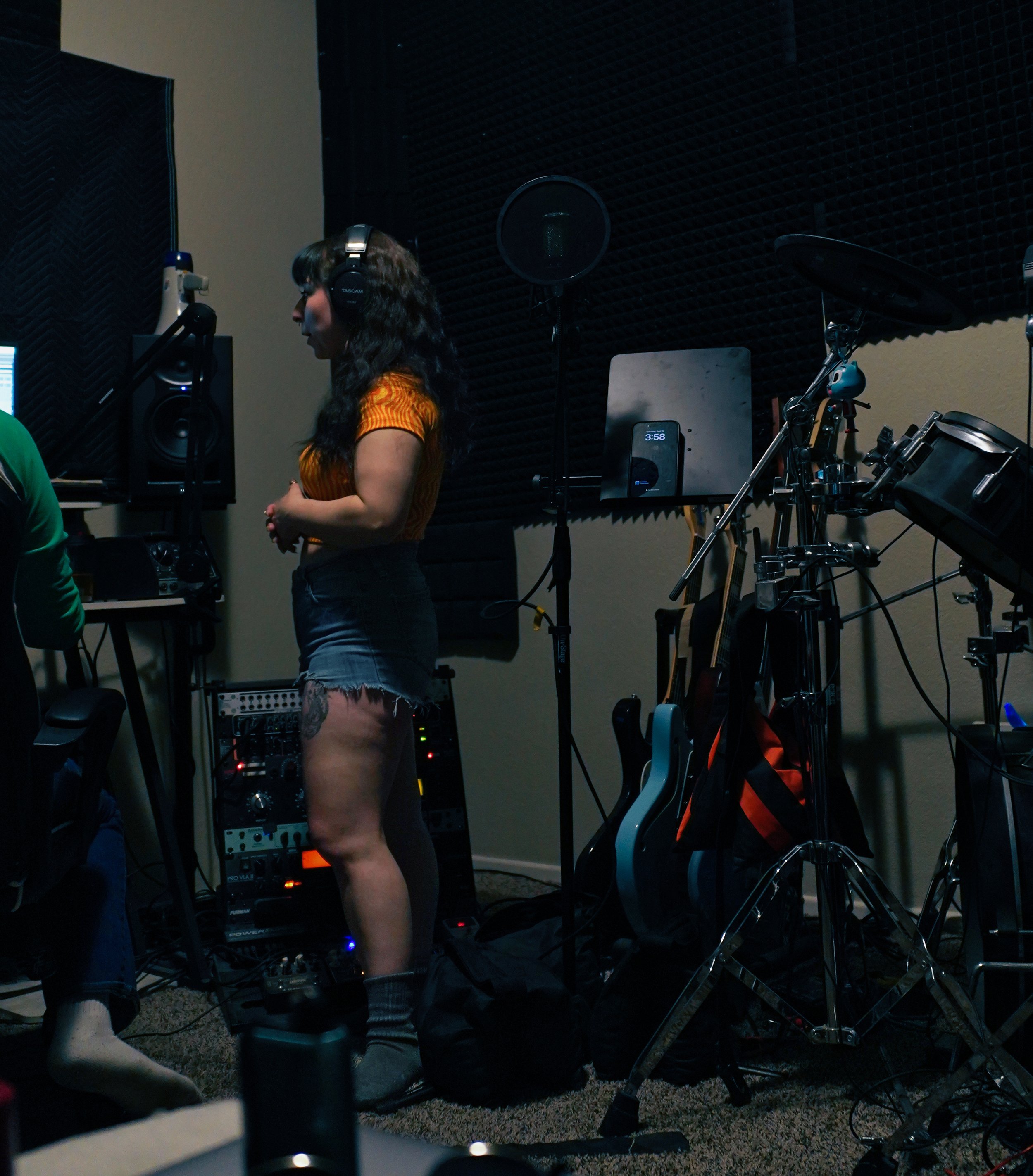 A woman with long dark hair, wearing a yellow top and ripped denim shorts, stands in a music recording studio with headphones on. She is surrounded by musical equipment, including guitars, speakers, and a microphone, in a room with black soundproofing foam on the walls.