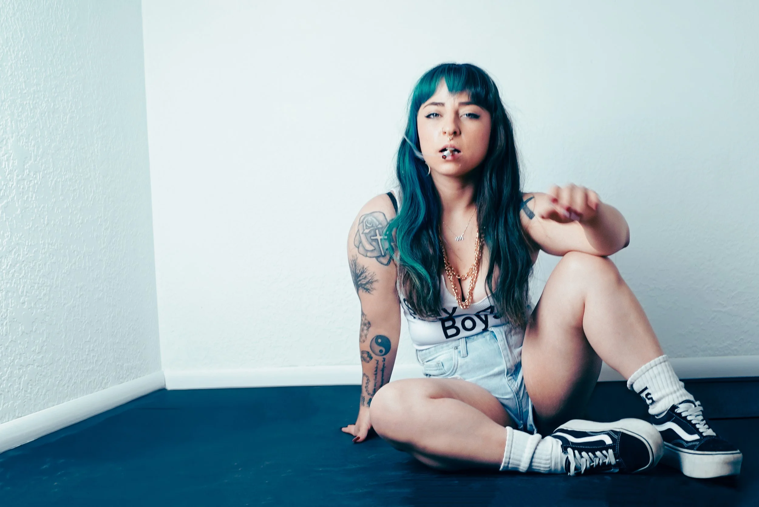 A young woman with blue and black hair, tattoos, and piercings, sitting on the floor against a plain wall, wearing a white tank top, shorts, and sneakers, with a cigarette in her mouth.