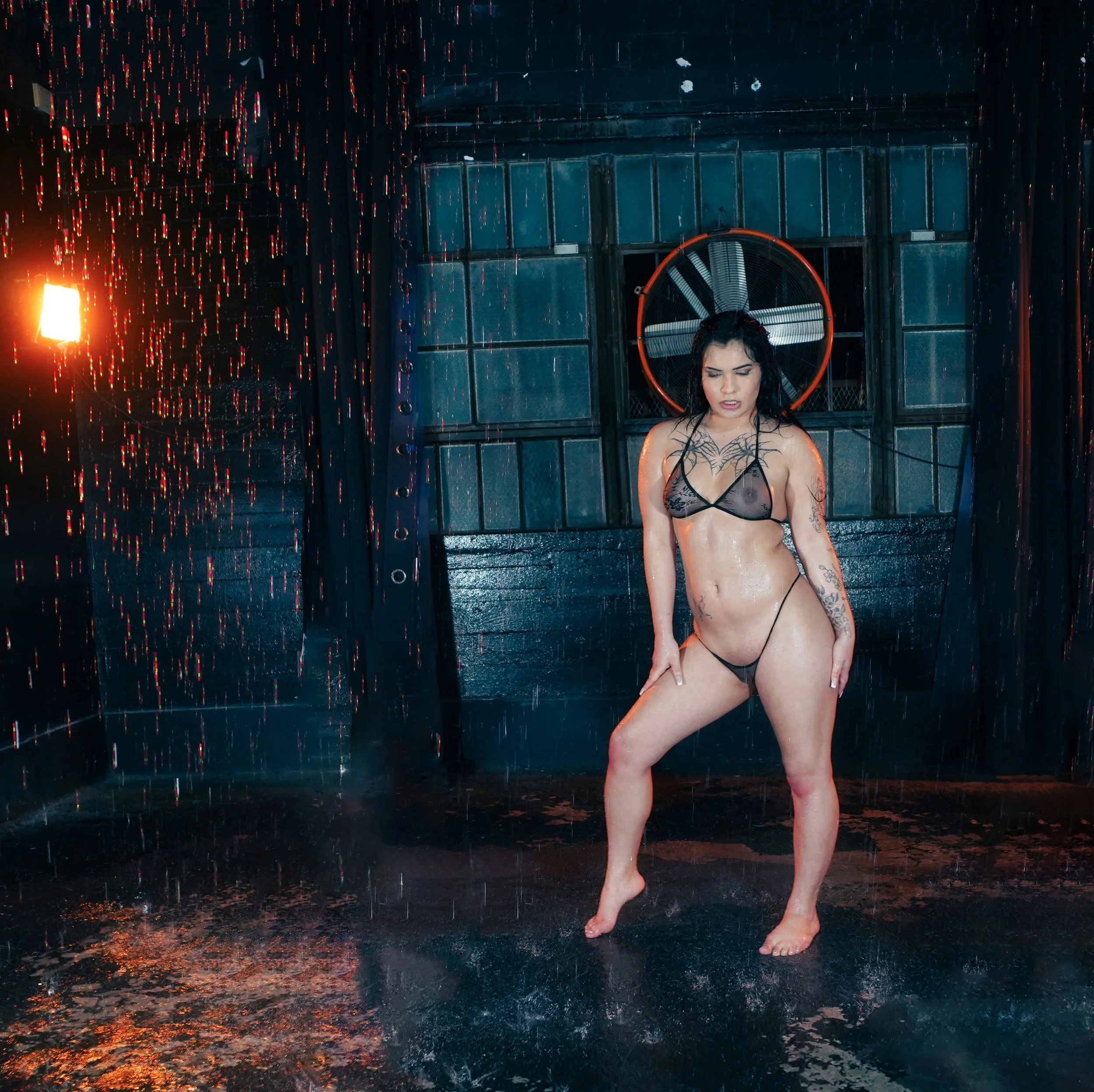 A woman with tattoos and wet hair in a black bra and orange shorts on her hands and knees in a dark, rainy setting with water falling from above.